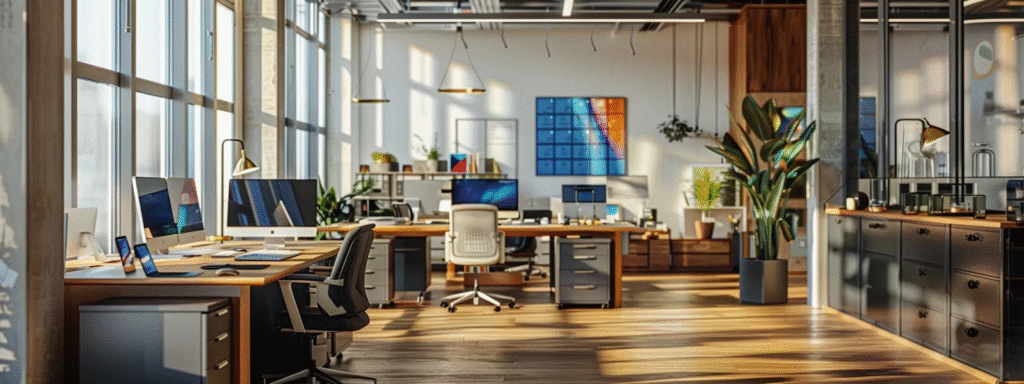 Alt text: Bright, modern office setup with digital workstations—ideal environment for businesses using top online fax software.