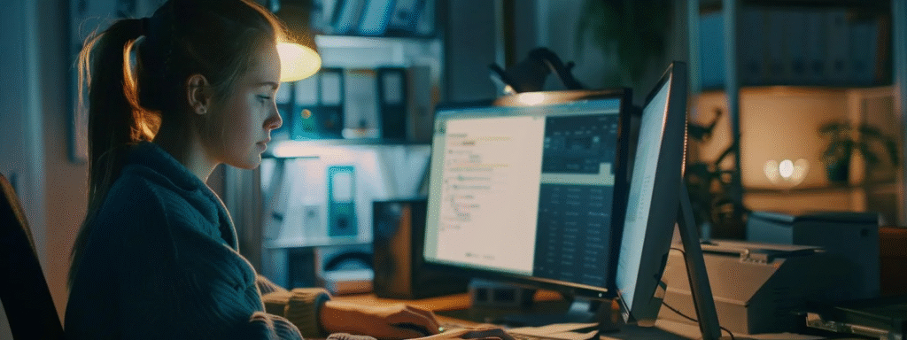 Alt text: Focused professional using dual monitors, illustrating seamless document exchange powered by the top online fax software.